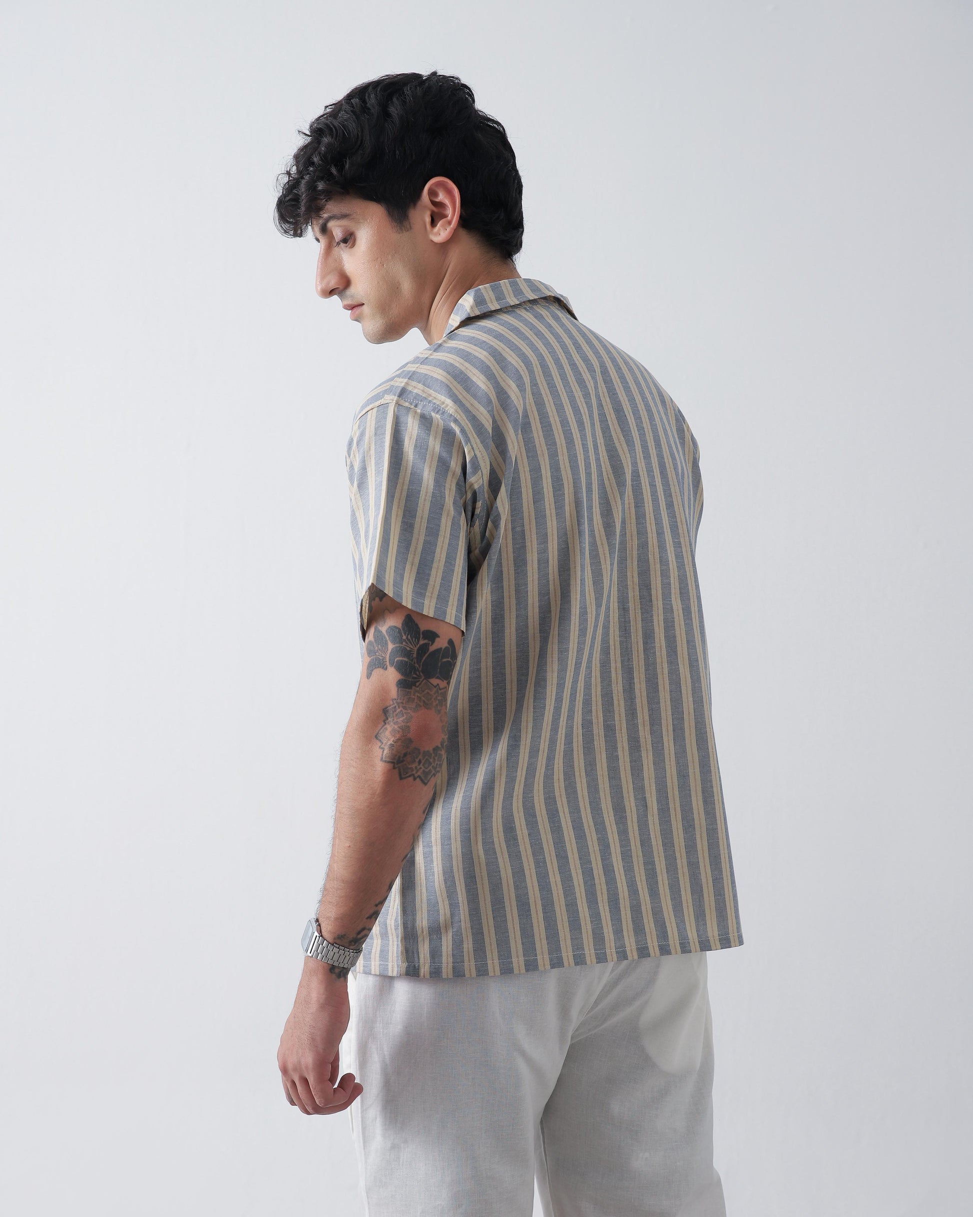Featuring a Cuban open collar and button-down front, the shirt carries a relaxed silhouette that flatters all body types. The muted beige and blue vertical stripes create a clean, elongated look, making it perfect for both casual and semi-formal outings. Its lightweight fabric makes it ideal for warmer days or easy layering.